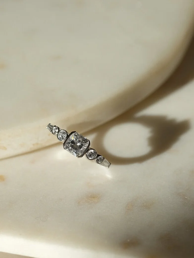 “I was looking for a one-of-a-kind engagement ring for my partner, and Ashley was a dream to work with. The floating halo of diamonds and sapphires around the lilac spinel feels classic yet modern, and has all the makings of a future heirloom.”